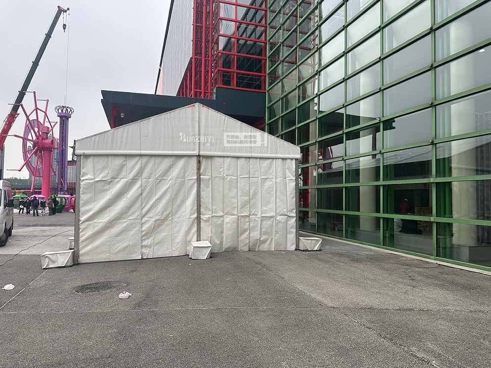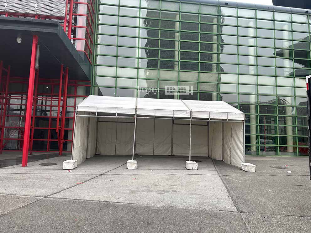 水泥地、瀝青地等硬化場地硬度高,地釘難以打入,此時(shí)地釘并非必需,需用其他固定方式替代。鶴壁篷房出租會(huì)根據(jù)篷房類型選擇替代方案:對(duì)于小型折疊帳篷,采用加重底座固定,每個(gè)底座重量15-20公斤,通過螺栓與篷房立桿連接,直接放置在硬化地面即可;對(duì)于大跨度人字形篷房,則采用膨脹螺栓固定,在篷房底座預(yù)設(shè)的螺栓孔處打入膨脹螺栓,將篷房與地面牢牢鎖定。