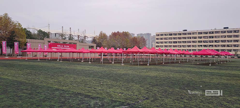 駐馬店職業技術學院校園雙選會是連接畢業生與企業的重要橋梁。駐馬店帳篷出租精準把握校園招聘場景的需求,以紅色折疊帳篷為核心功能載體,搭配道旗與桁架構建科學布局,為雙選會打造出秩序井然、信息清晰的招聘空間,助力畢業生與企業高效對接。